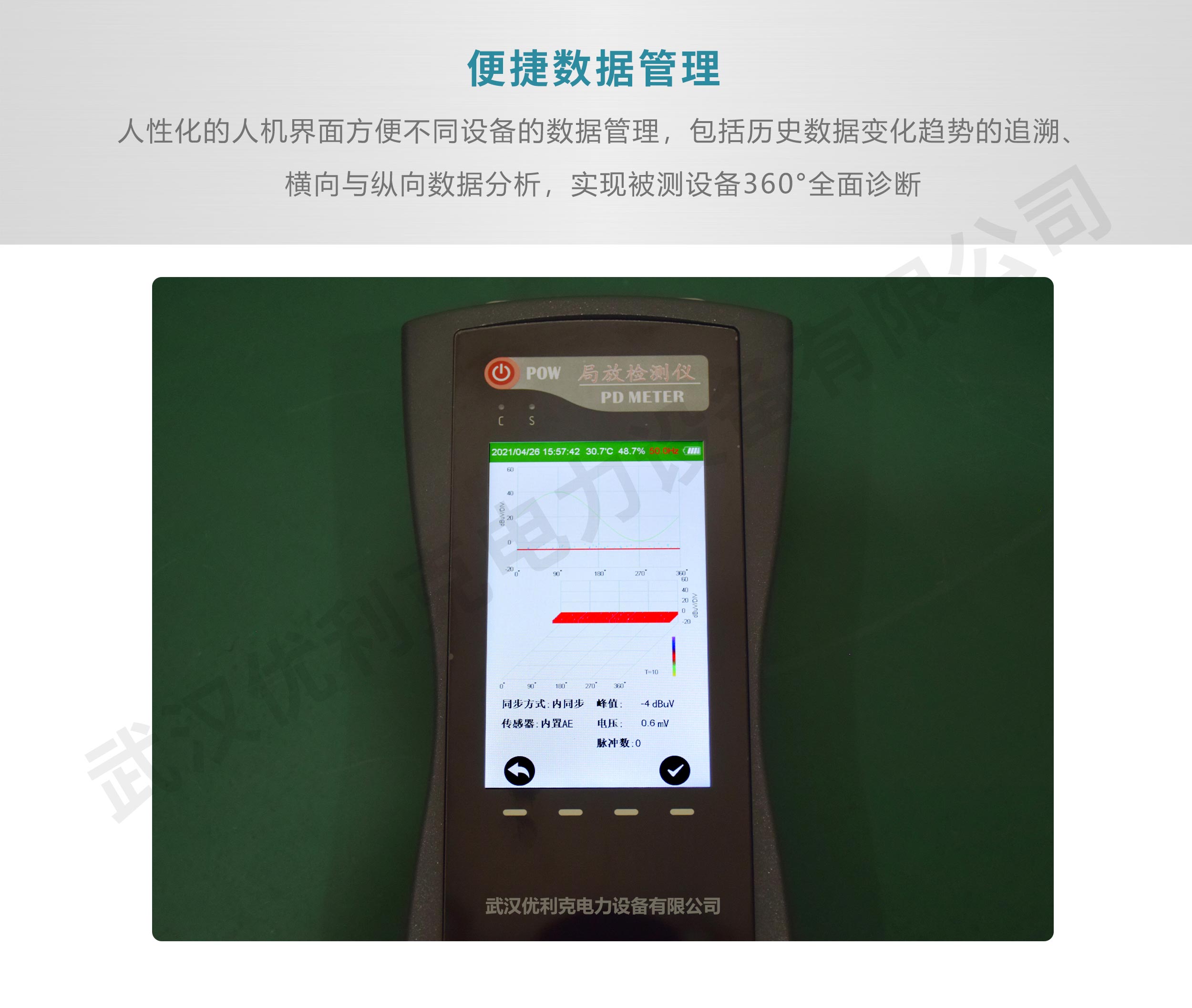 可以提供二維、三維圖譜的存儲以及讀出功能等,彩屏LCD顯示,不同顏色燈指示檢測結(jié)果,可以方便、快速評估電氣設(shè)備局部放電情況。
