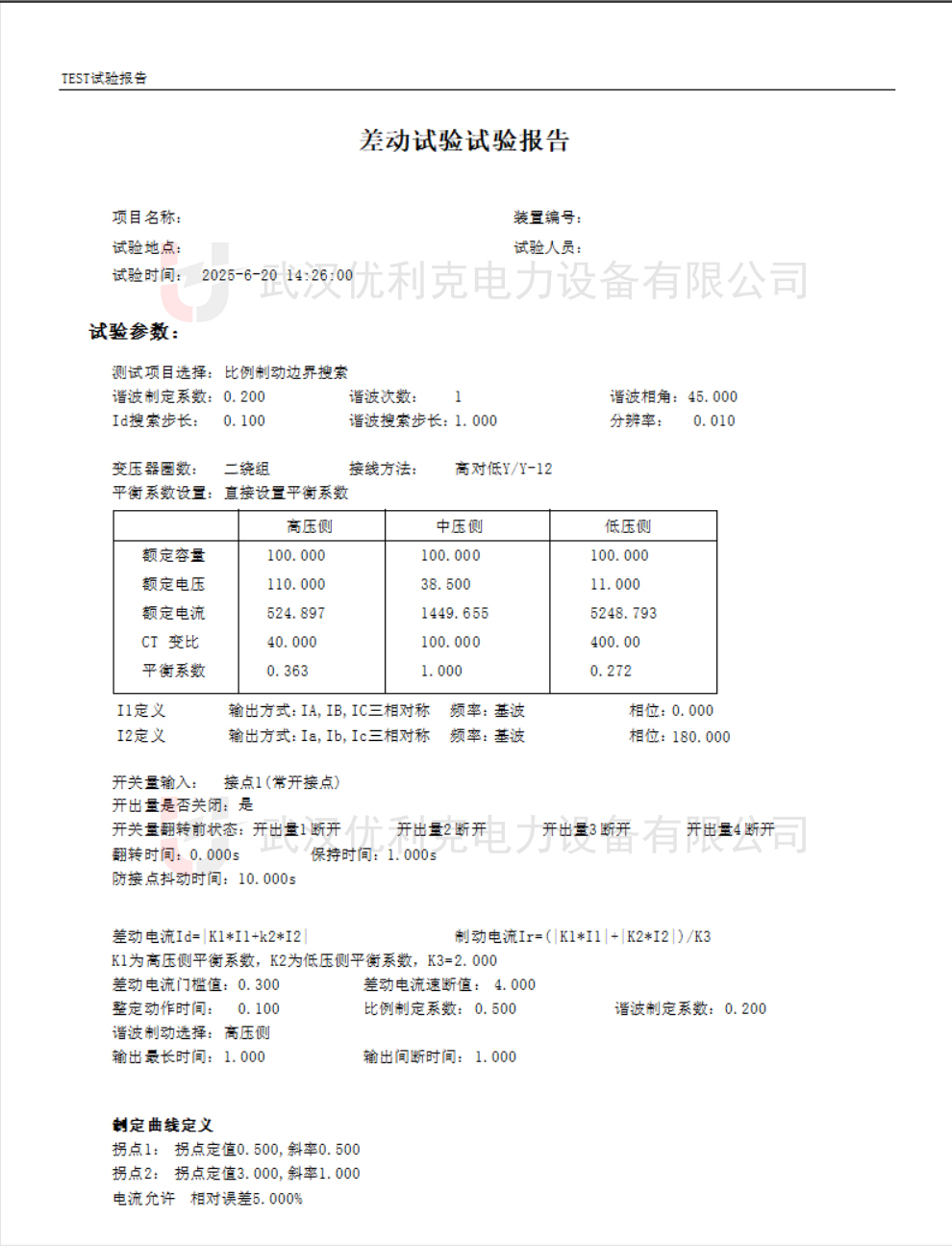 • 平衡系數:根據CT變比和變壓器額定電流計算高低壓側的平衡系數(如高壓側Kh=1,低壓側Kl=0.795)。