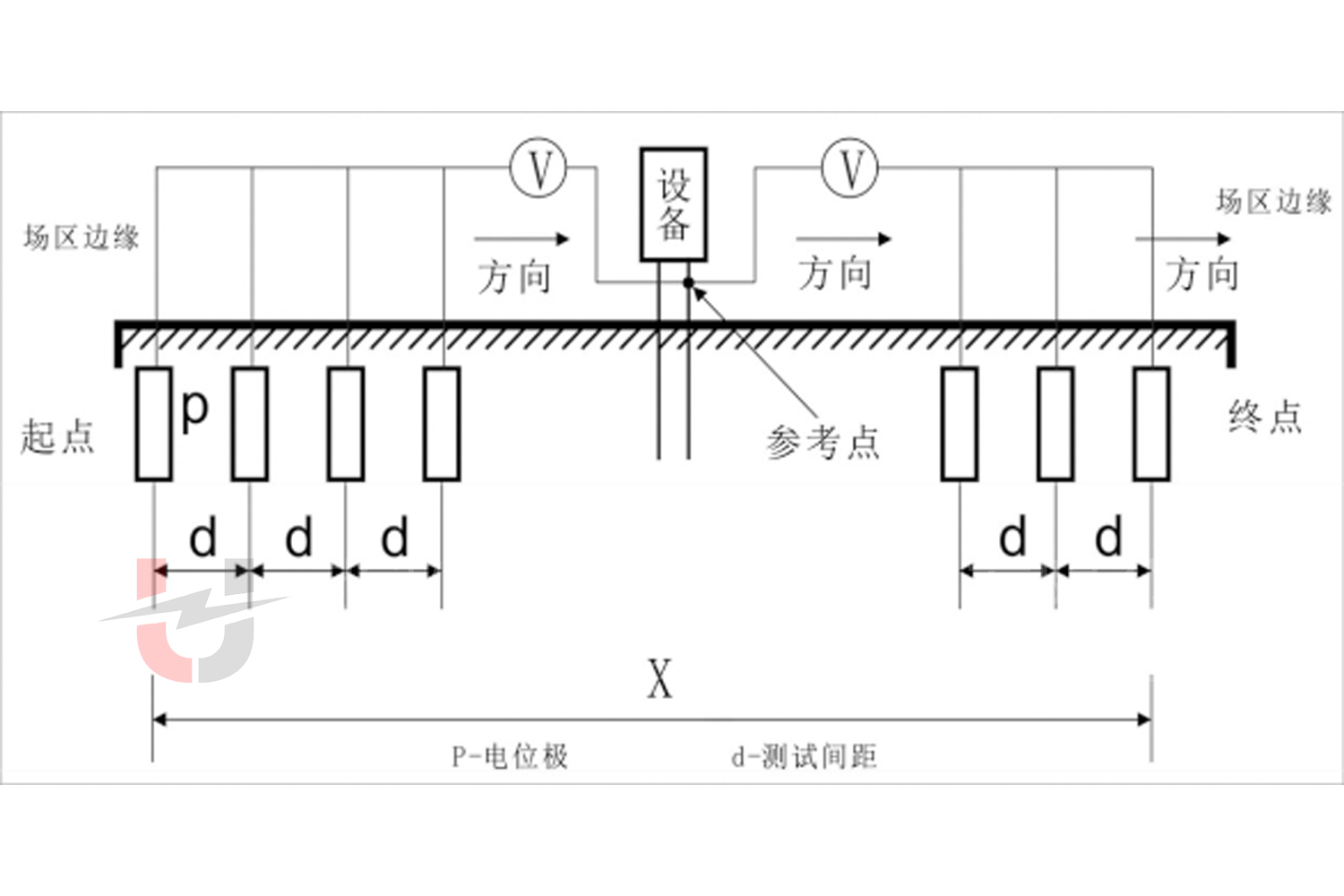 電壓極 P 與接地端的距離(DPE):≈0.618×DCE(基于 “零電位點(diǎn)” 理論,最小化測(cè)試誤差),若現(xiàn)場(chǎng)空間受限,可調(diào)整為