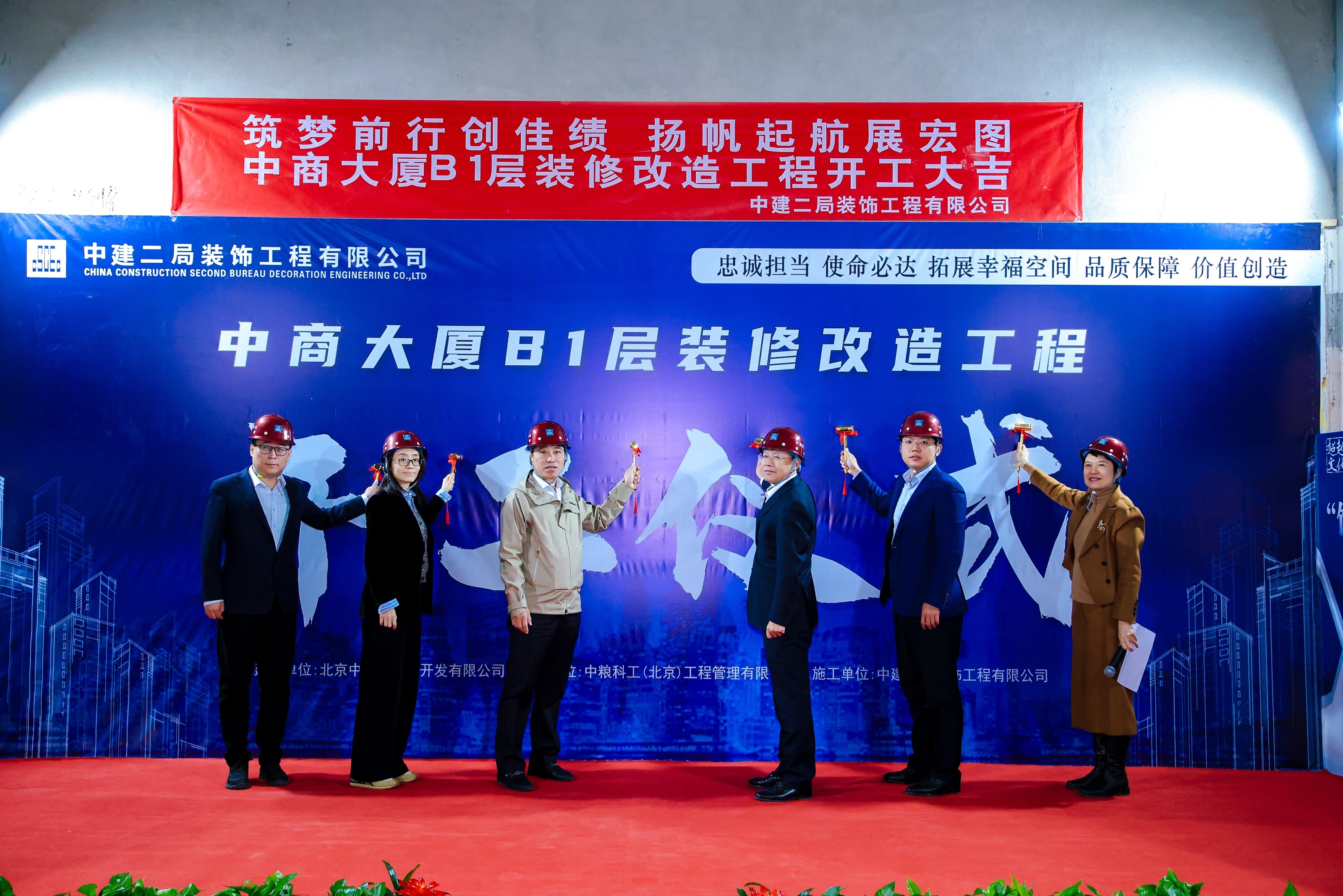 ??10月28日,中商大廈B1層裝修改造工程舉行開工儀式,建設(shè)、施工、監(jiān)理單位有關(guān)人員齊聚施工現(xiàn)場(chǎng),共同見證工程啟動(dòng)。中商集團(tuán)黨委副書記、總經(jīng)理張雷,副總會(huì)計(jì)師顧郁,中建二局總經(jīng)理助理、中建二局裝飾工程公司黨委書記、董事長(zhǎng)董亞興,四川分公司總經(jīng)濟(jì)師劉波,中糧科工工程管理公司總經(jīng)理?xiàng)罴蚜脸鱿_工儀式。中商大廈黨支部書記、董事長(zhǎng)、總經(jīng)理謝群主持儀式。